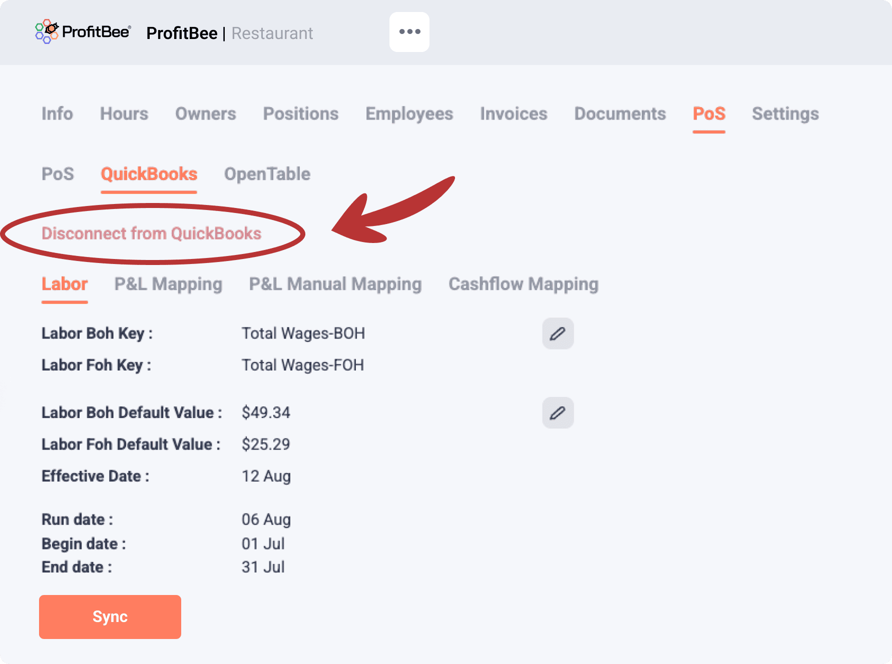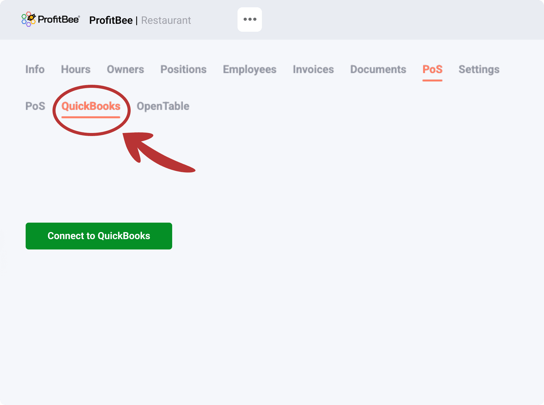 Select the option for POS integration as shown on image, then select the QuickBooks option and click on Connect