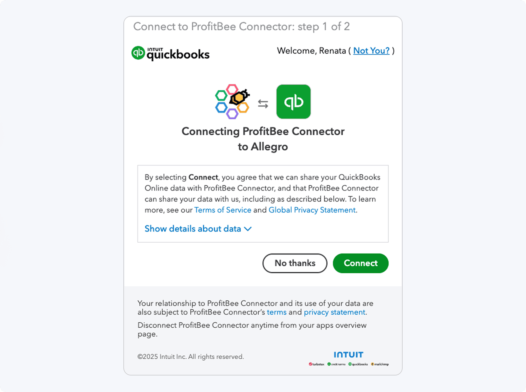 Select Connect and login to your QuickBooks account. Now you’re all set up!